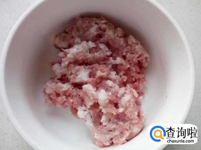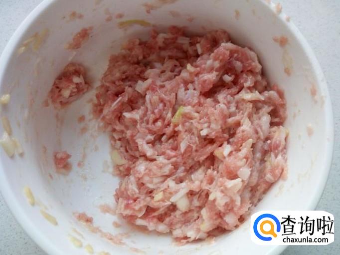 把放入调料的肉馅顺着一个方向搅拌粘稠上劲。
