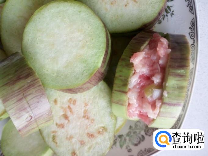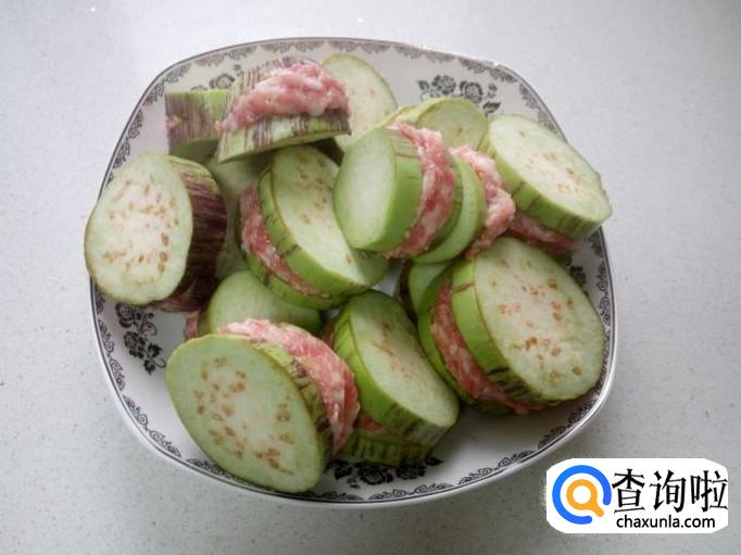 然后用筷子把调拌好的肉馅,放入到茄子夹中。