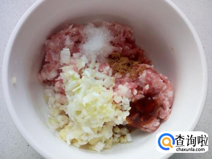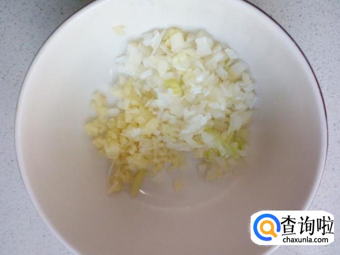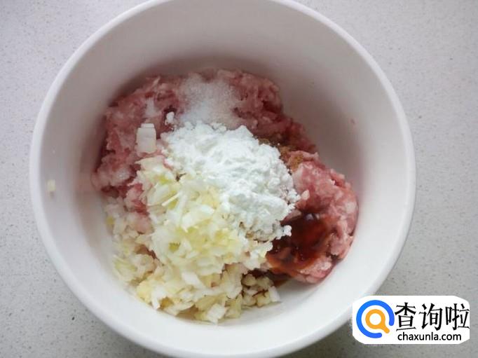 把葱,姜,末放入碗中,放入盐,味精,五香粉,料酒,耗油,芝麻油,放入一匙儿淀粉。