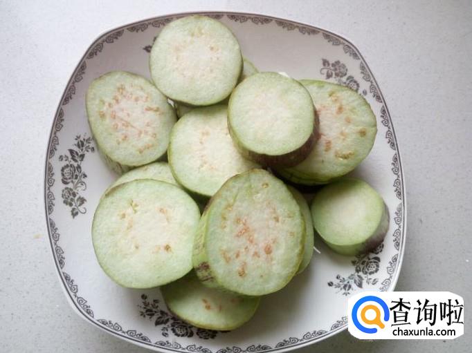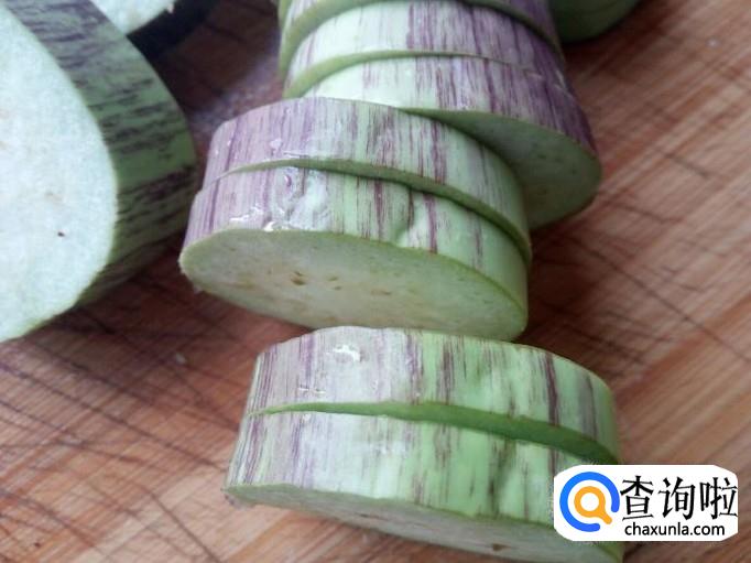 把茄子清洗干净,切成2公分左右厚的片,然后用刀在中间切成对半的茄子夹(不能断开)。