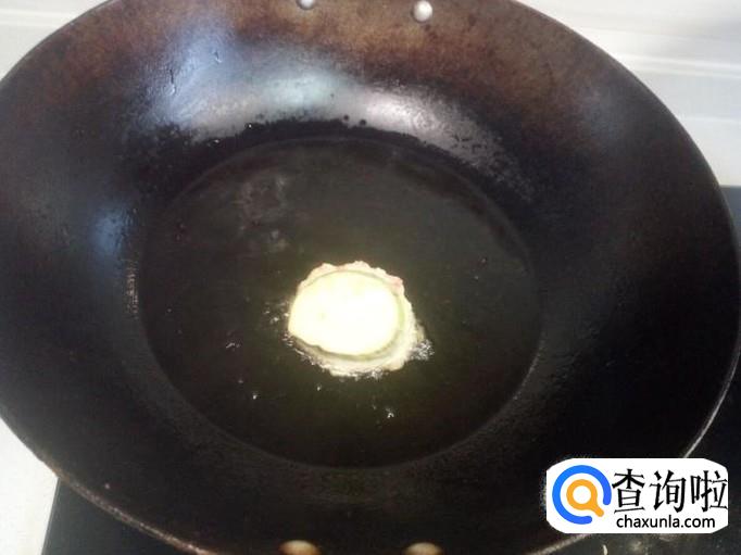 锅内放入油加热,油六成热时,把茄子夹裹上面糊,依次放入油里煎炸。