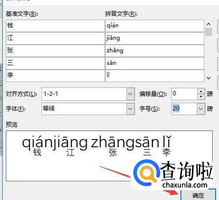 然后设置好拼音的字体大小即可,接着点击确定,这时候就能在word文档中看到文字都加上拼音了,非常快速。