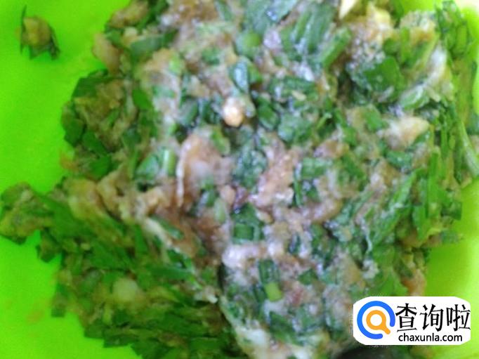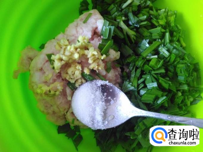 猪肉剁成肉末,加适量的盐、韭菜末、姜蓉。