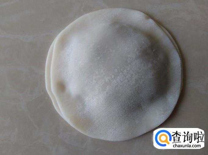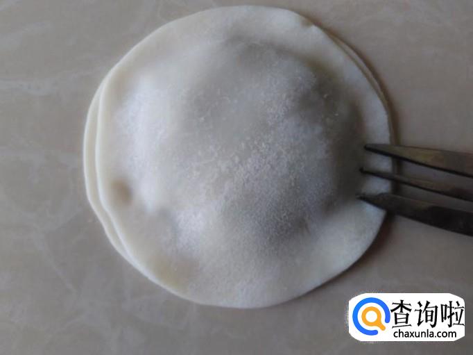 拿一块饺子皮摆在台板上。