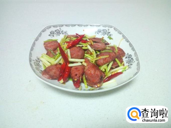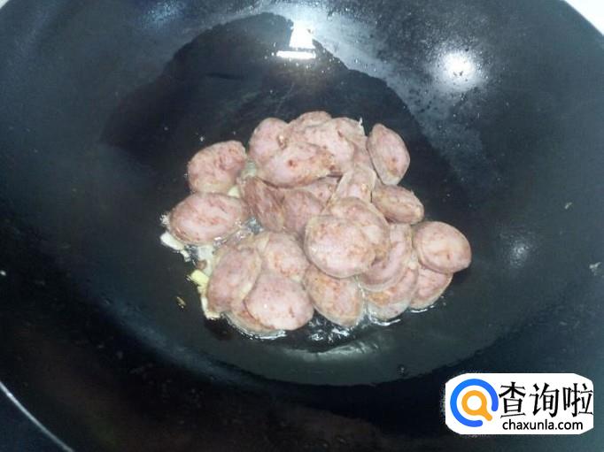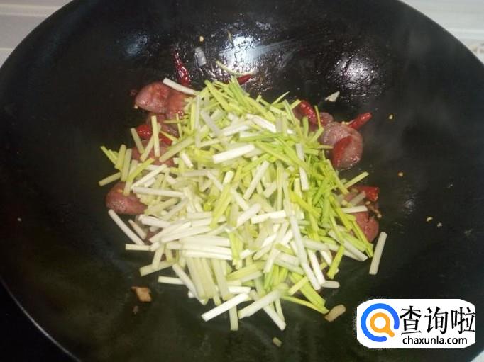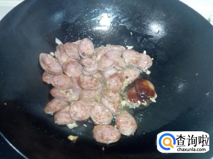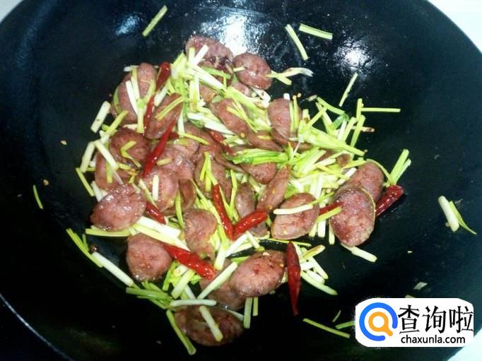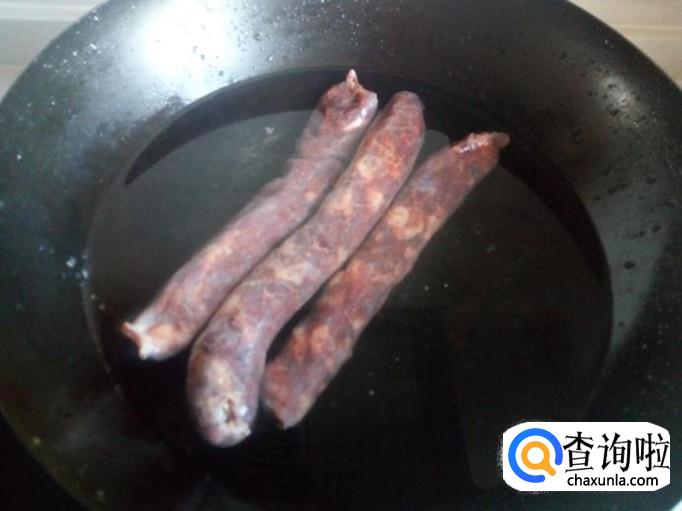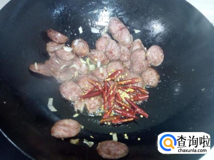 锅内放入油加热,油热后放入花椒,葱,姜,爆锅。放入腊肠小火翻炒。