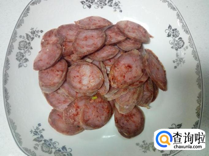 腊肠用水清洗干净,控干水分,放入冷水锅中烧开。水开后小火煮四十分钟的时间捞出晾凉,然后用刀切成03公分左右厚的片(我用了一根腊肠)。