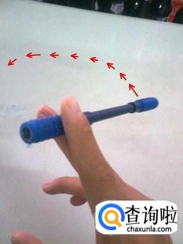 一指和二指夹住笔后手向下翻,用一指和二指夹笔逆时针甩动一圈