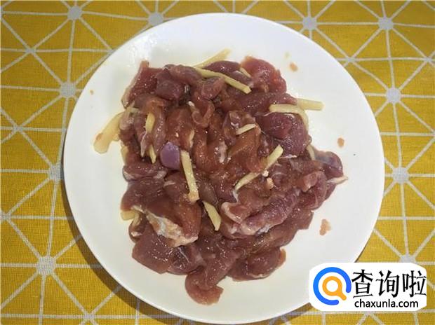 在瘦肉中加入适量的姜丝、花生油、酱油,腌制一会。
