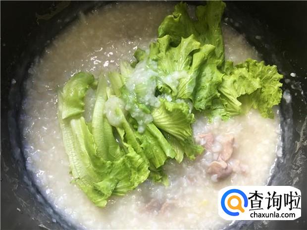 瘦肉粥煮开后,加入少许料酒,再把生菜放入锅中,搅拌均匀。放入生菜后,不需要再煮了,青菜烫一下就熟的了。