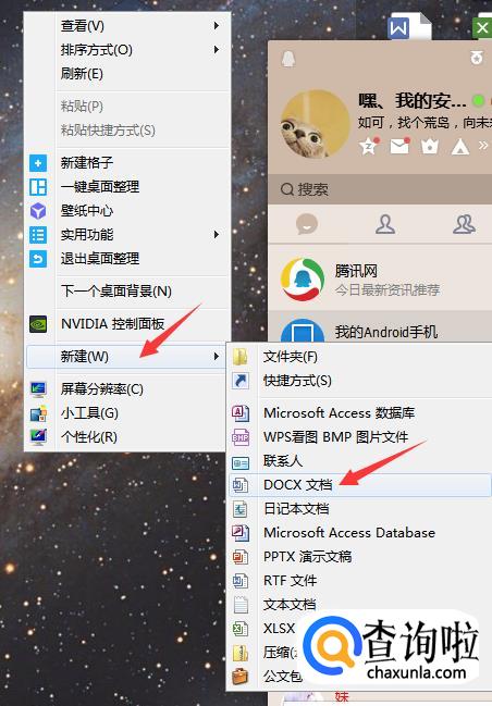 首先在电脑的空白桌面处,点击【右键】,选择【新建一个word】,有些电脑不同,【DOCX文档】和【新建一个word】一样的。