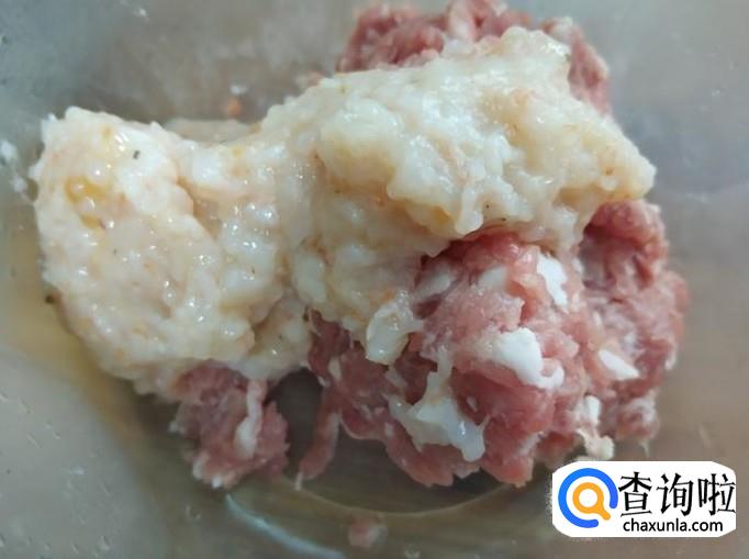 最后将之前保持完整的整个虾放入馅料中,用筷子拌匀。