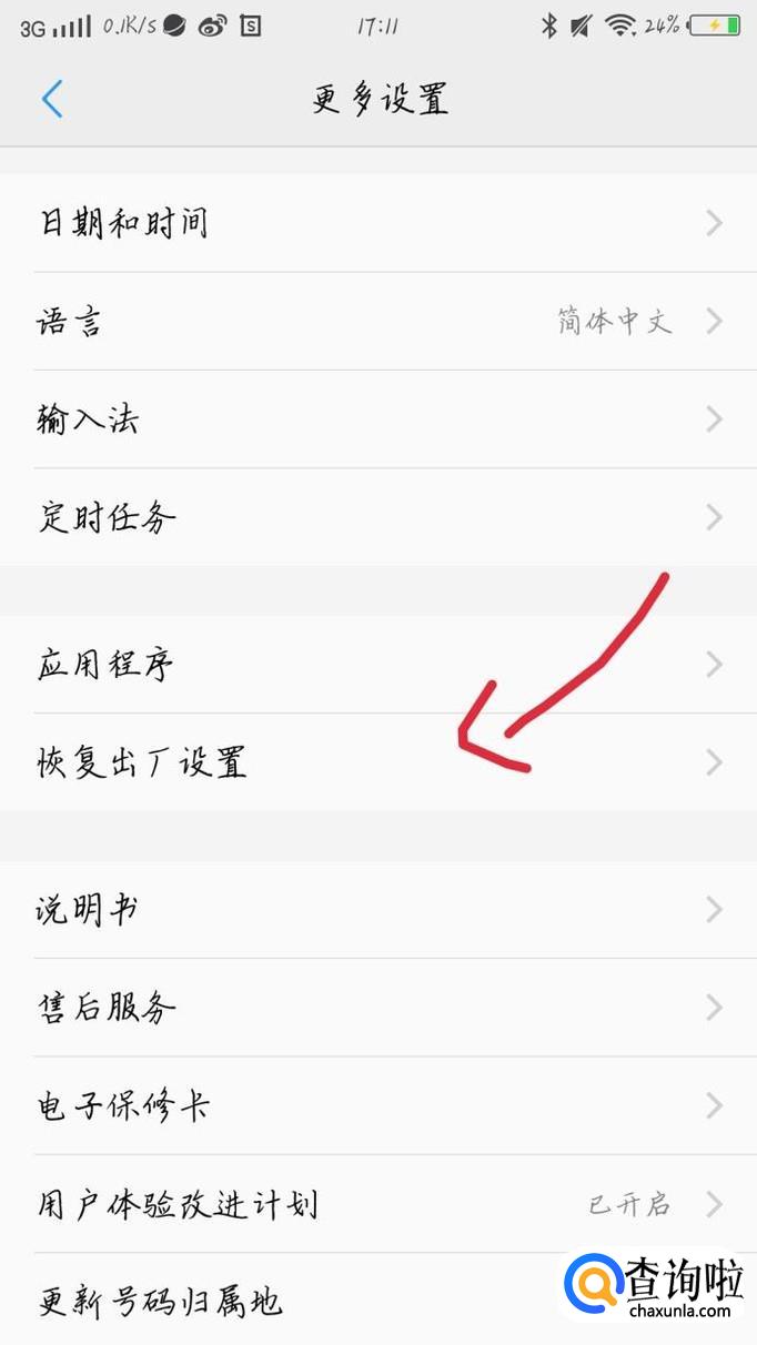 点击“恢复出场设置”选项,如图1箭头所示。这样你就可以恢复手机的出场设置了。