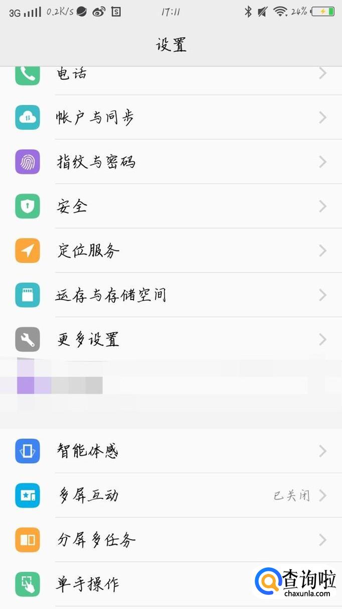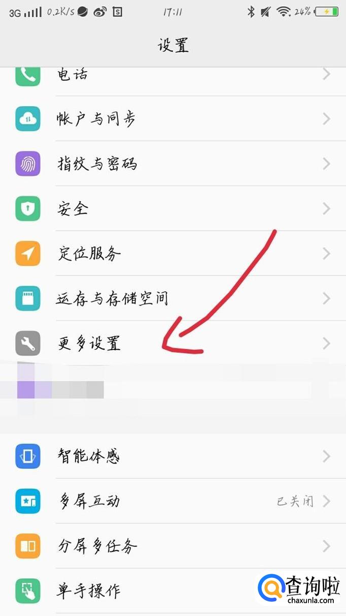 向下滑动手机,点击“更多设置”选项,如图1箭头所示。你会看到出现一个新的界面,如图2所示。