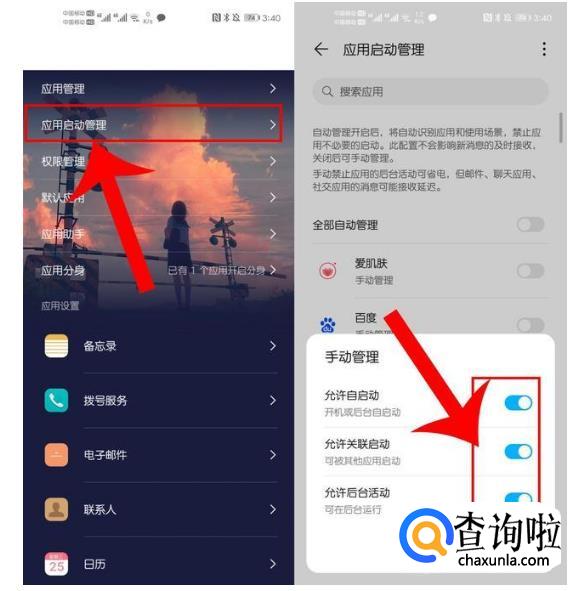 设置→应用→应用启动管理→将自动管理关闭→转为手动管理→接着手动开启允许自启动、允许关联启动、允许后台活动等按钮。