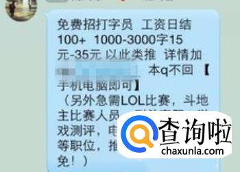 在微信朋友圈,QQ群等地方随处可见散发的广告,上面写着如:“招聘打字员,工资日结,日入几百,月入上万等,”都是常见的吸引眼球的方式之一,可信度为零,若真如此高收入的话,那岂不都去做了。