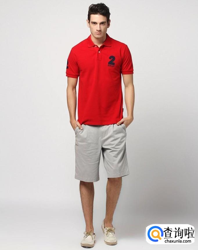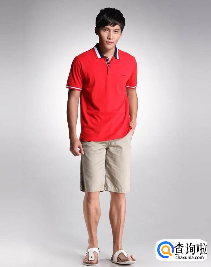 红色短袖配浅灰色短裤整个人看起来比较有活力,又不失时尚感,男孩子穿了还显得MAN一些。