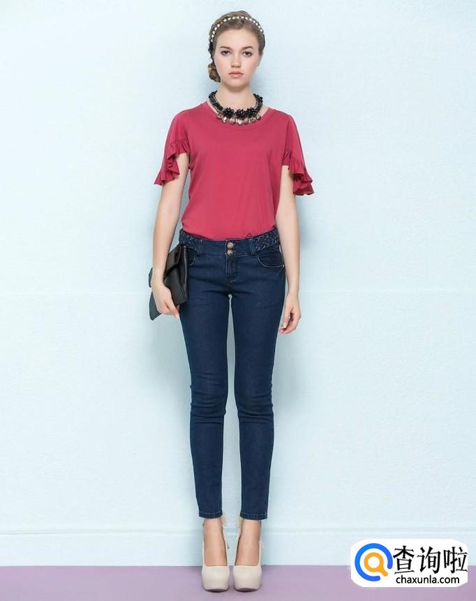 红色短袖配九分紧身牛仔裤整个人看起来很显身材,休闲中又有时尚感,适合各种场合的穿戴。
