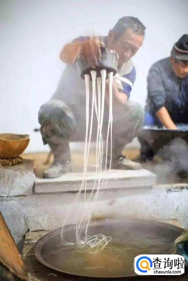 然后把面皮盛入平底的盘子里面,只需要在盘子的底部薄薄铺上一层小麦淀粉水就可以,凉面的话我们可以用漏勺,把水烧开后把淀粉水说着漏勺倒下去这样子凉面就做好了。