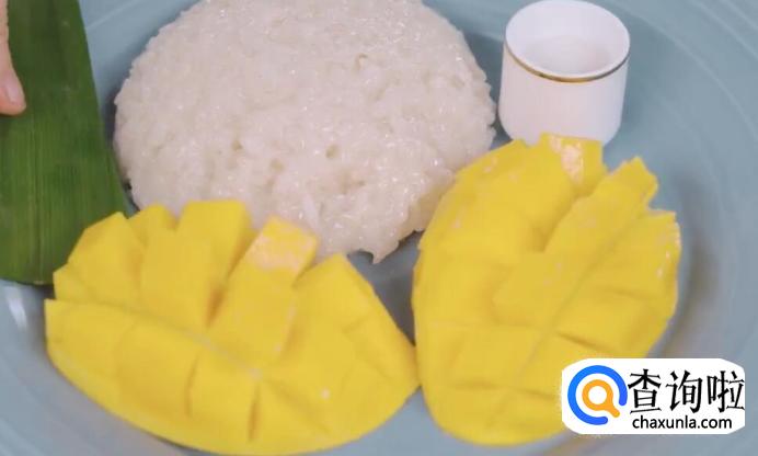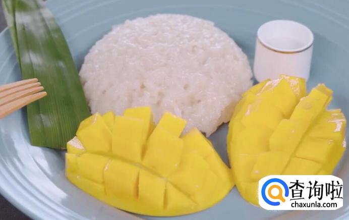将处理好的芒果放入盛糯米的盘子中,再放上斑斓叶。