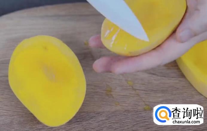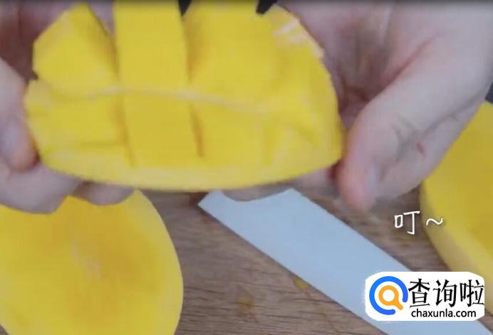 将芒果切成三块,然后往中间划上几刀,再用手向外翻转。