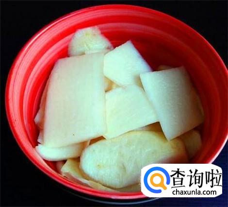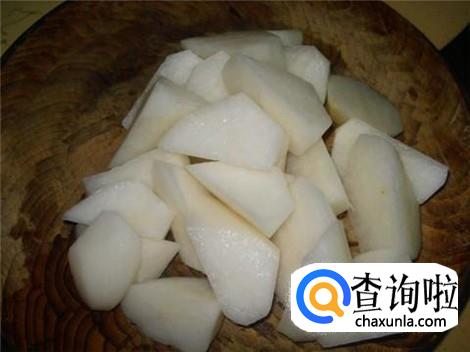 小白萝卜去掉萝卜缨子,清洗干净,浸泡在清水里半小时,再次清洗几遍就彻底干净了,切成大块。