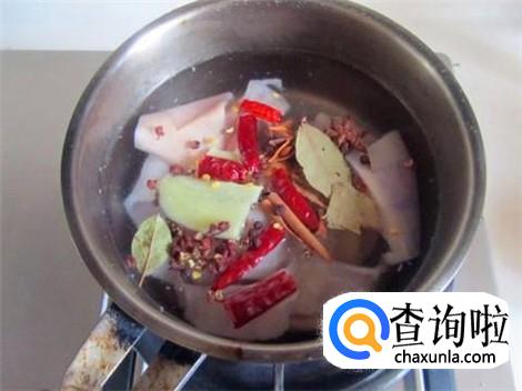 锅里加上花椒大料八角,再加上桂皮,喜欢香叶那个味道的可以加上香叶,然后多加食盐和白糖以及生抽,再倒入清水煮开,放凉。