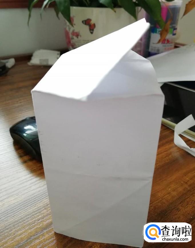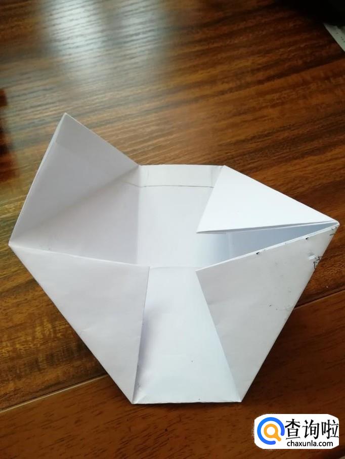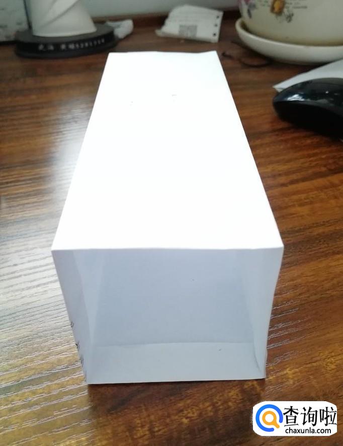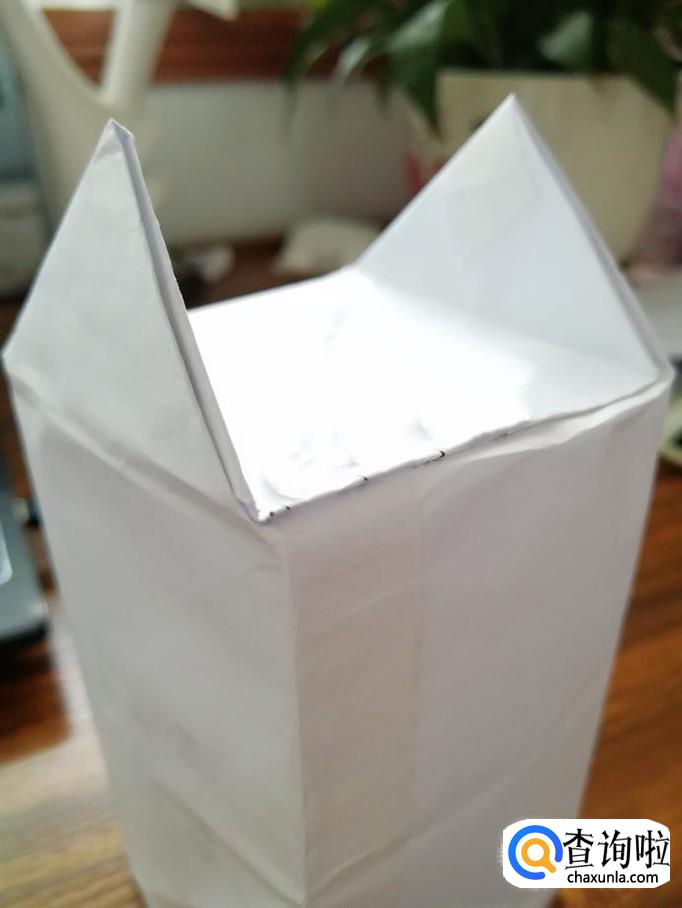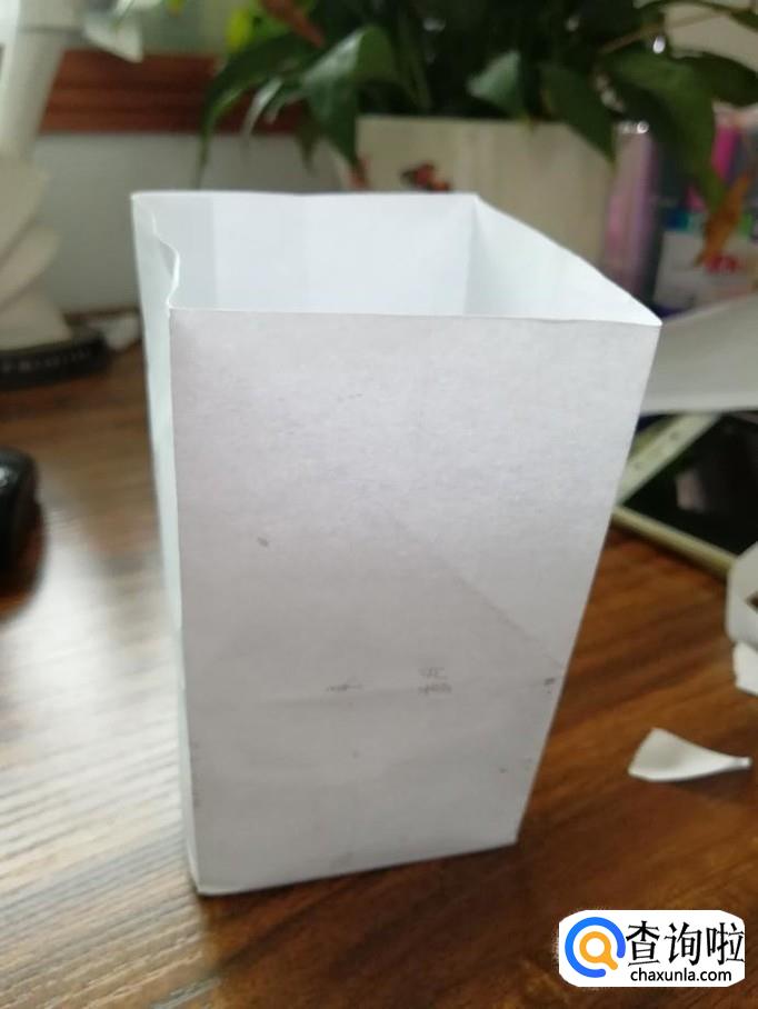 打开成长方体的形状,将底部折成三角形后粘好,放入东西后,再用同样的方式粘贴好即可。
