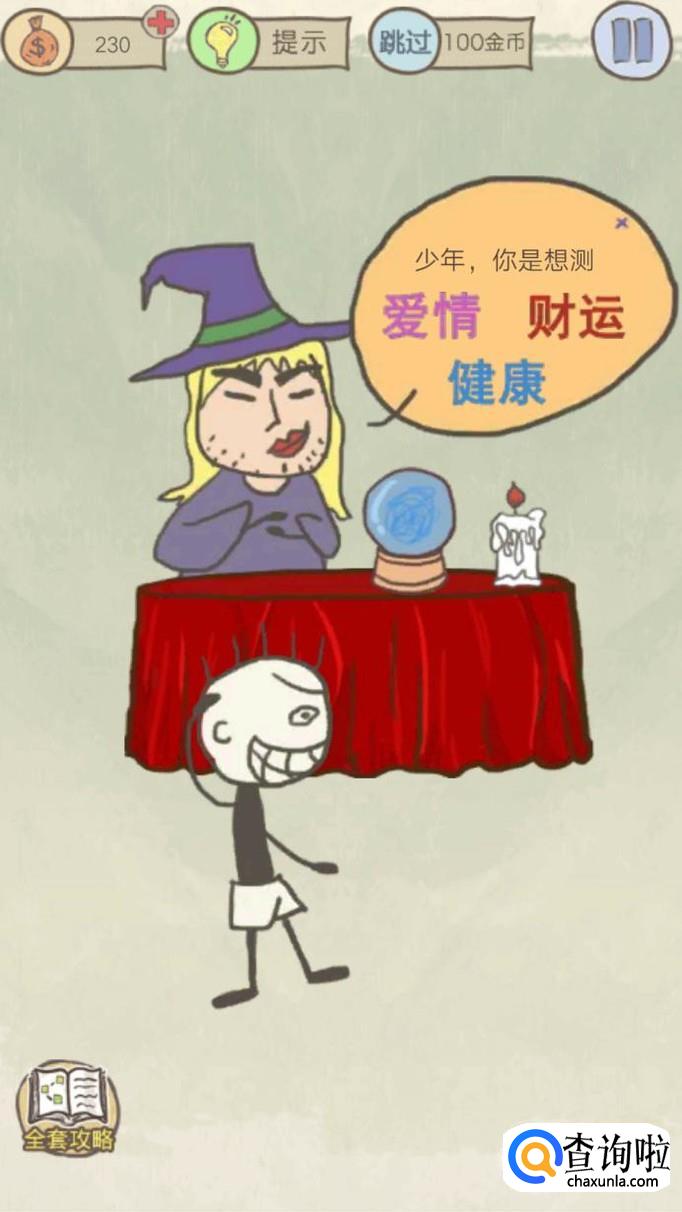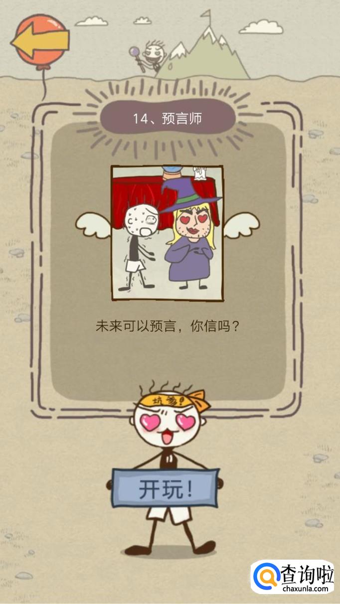 第十四关:预言师说的话框右上角有一个“×”符号,点击这个符号就可以过关了。