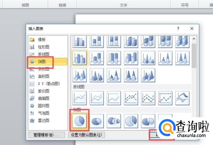 弹出的界面,我们点击饼图,然后点击选择一个饼图图表,之后我们点击确定;