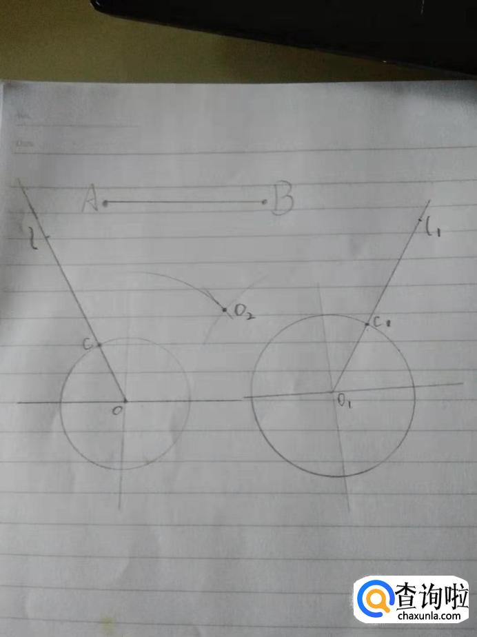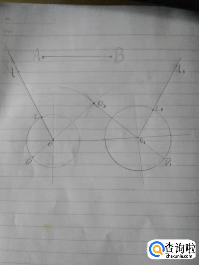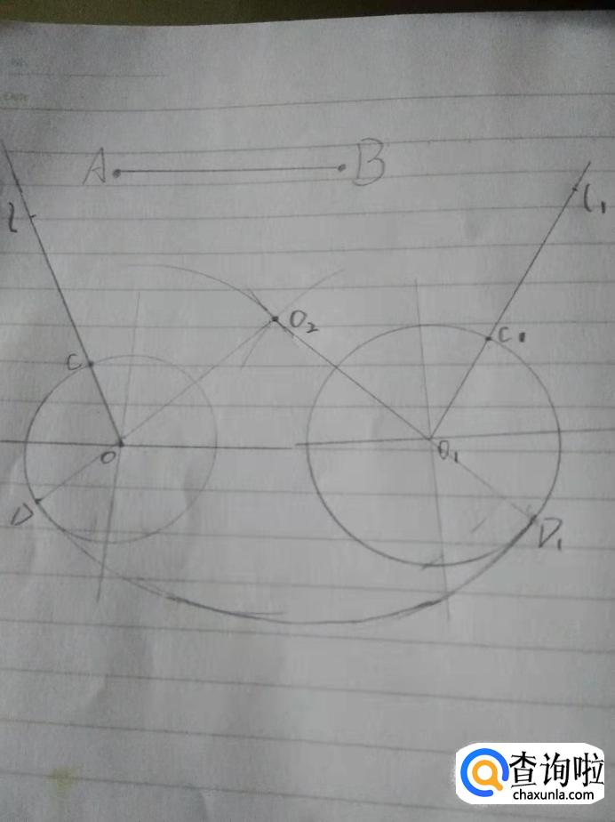 最后以O2为圆心,线AB为半径画圆,过点D和D1,即为该两圆的外连接圆弧。
