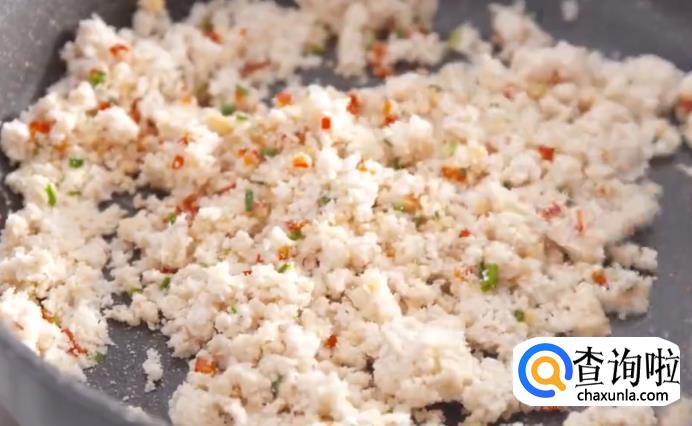 之后起锅热麻油,爆香小葱和红椒碎,下豆渣翻炒,保持中小火。
