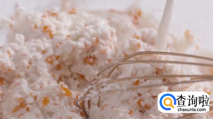 首先在面粉中加盐和豆渣,胡萝卜碎,芹菜碎,然后倒入净水和熟豆浆,比例大约是2:3。