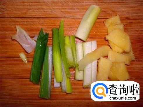 姜片准备一下,记得把生姜的皮去掉,小葱准备一棵切成葱段。其余材料不要加了,孕妇本身不适合过多的调料,且有些调料对孕妇健康不好。