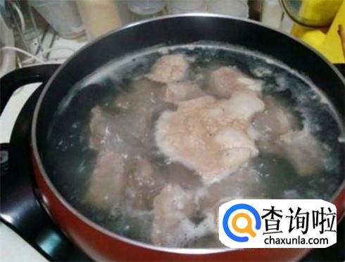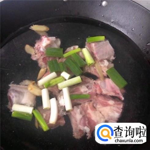 锅里烧开水,把排骨放进去焯几分钟,不断用勺子翻几下,一般等到排骨上面的肉变色之后再捞出来,捞出来之后在流动水里冲洗几次,然后浸泡冷水中十分钟,再将水倒掉控干水分。