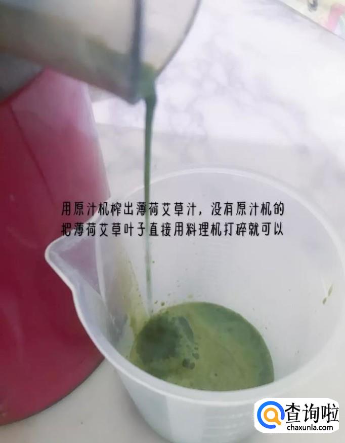 然后用榨汁机榨出薄荷和艾草汁,如下图所示。小贴士:如果没有榨汁机的朋友们,可以用料理机直接把材料打碎就可以了。