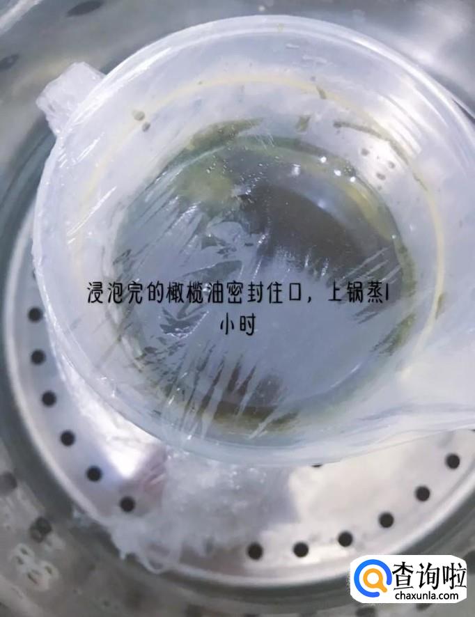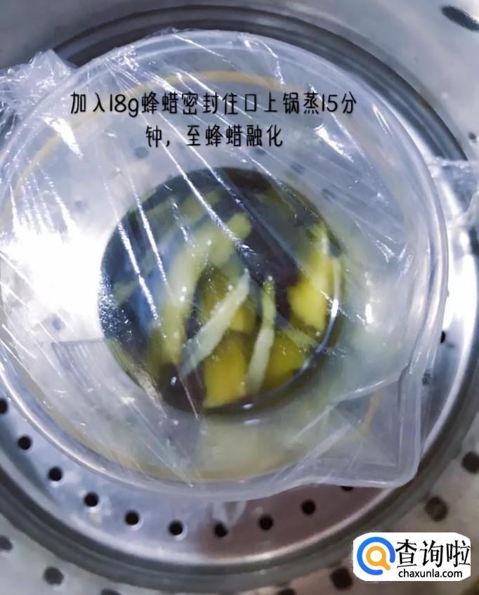 接着在橄榄油中加入18g的蜂蜡,封口上锅蒸15分钟,如下图所示。