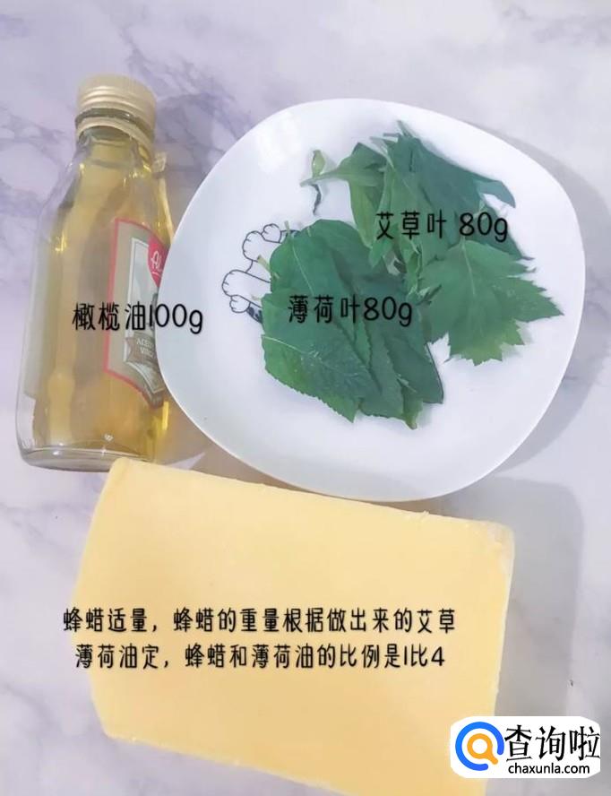 材料:橄榄油100克。薄荷80克,艾草叶80克,蜂蜡适量。