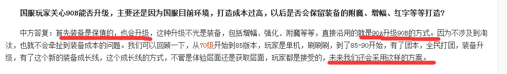 在各大论坛和贴吧都可以看到讨论90B不能升级的相关帖子,两服玩家都直言要脱坑。迫于玩家舆论的压力,韩服策划随后宣布魔兽首饰(国服对应超时空)和海博伦套装可以在95级版本进行升级,但是中方此时还没有任何确定性消息。