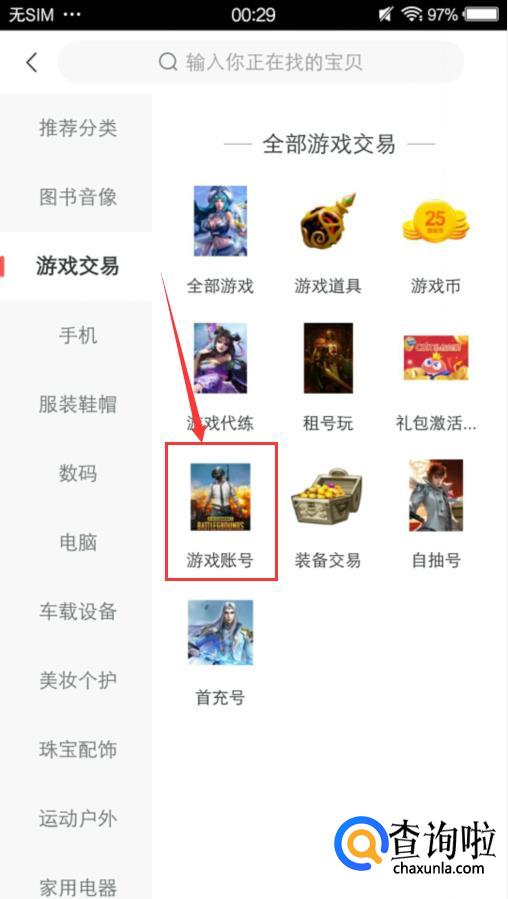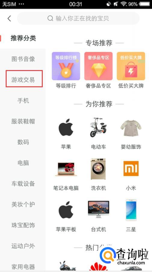 然后进入分类页面后,我们选择‘游戏交易’,这里的分类每个人的排序可能会不一样,所以我们只需记住选择游戏交易即可。