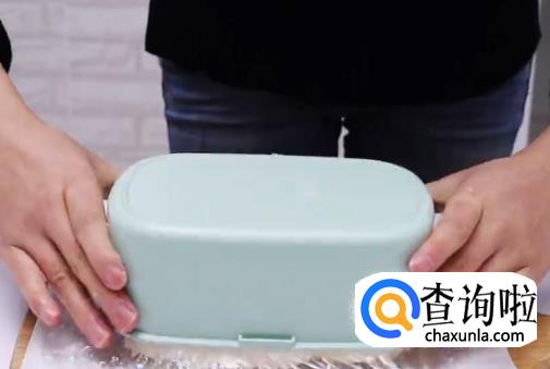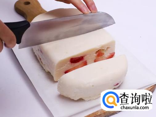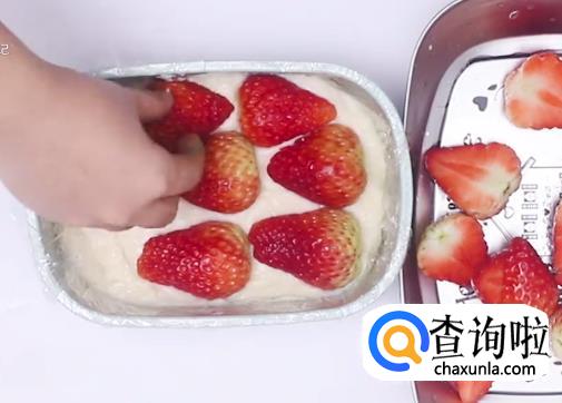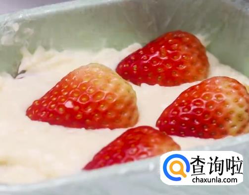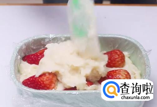 将奶糊倒入模具中,然后一层草莓一层奶糊这样铺平,放入冰箱冷冻。