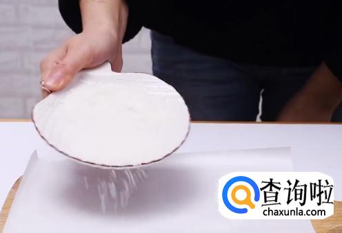 将椰蓉洒在案板白纸上,然后将冻好的奶块倒出来,用刀切成小块。