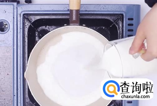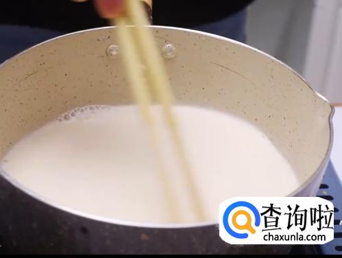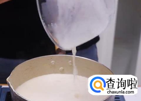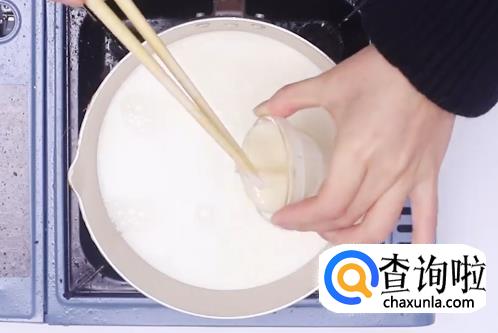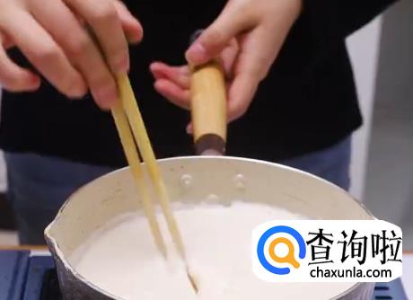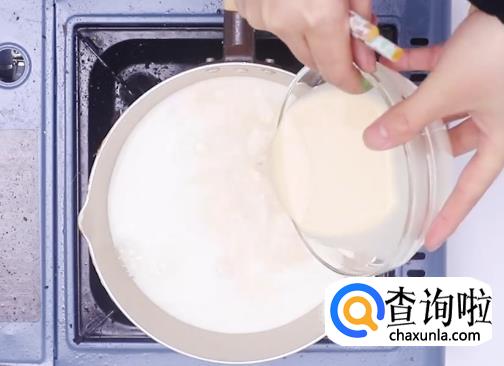 然后倒入奶糊,不断搅拌直到形成粘稠状。