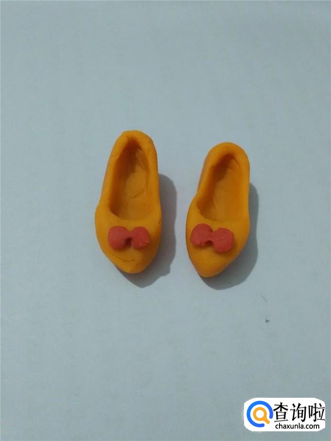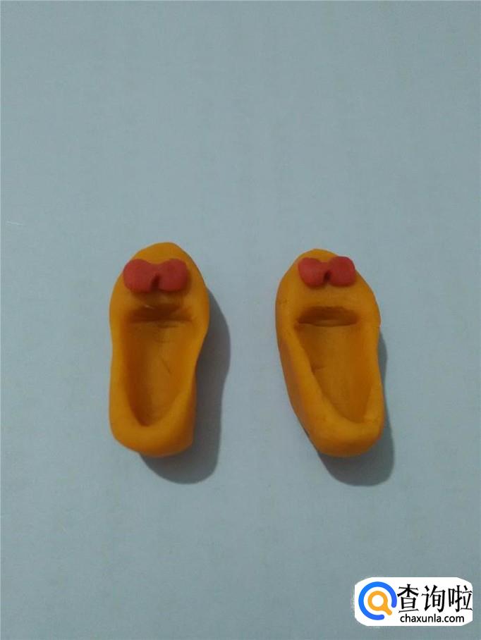 把两个蝴蝶结粘在两只鞋的鞋面上,娃娃的新鞋就做好了。