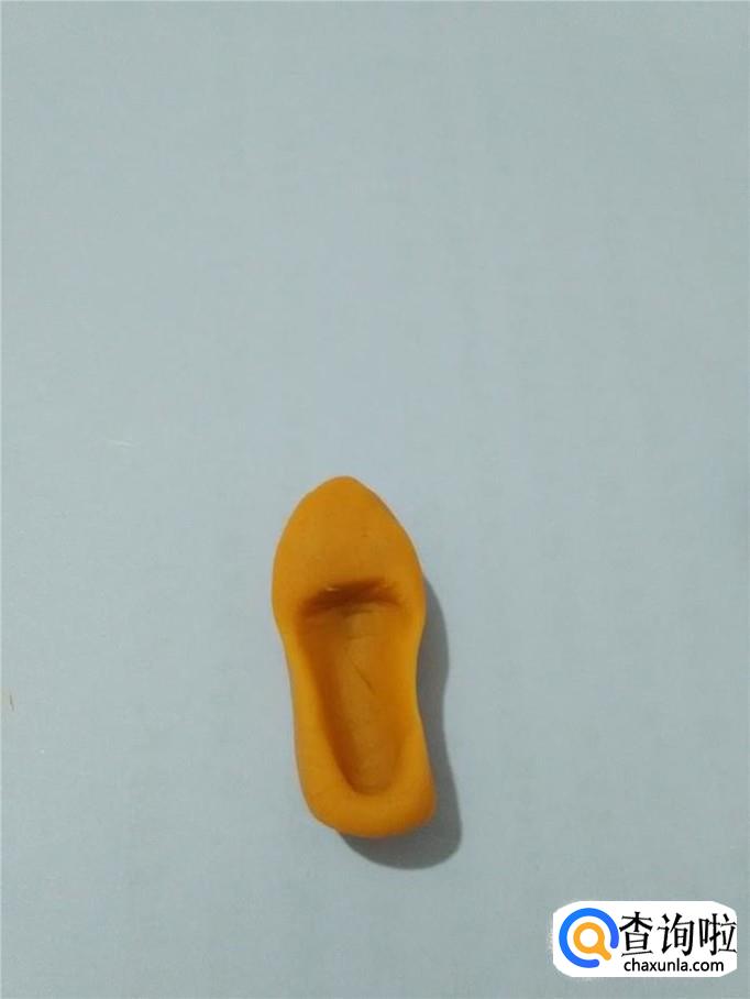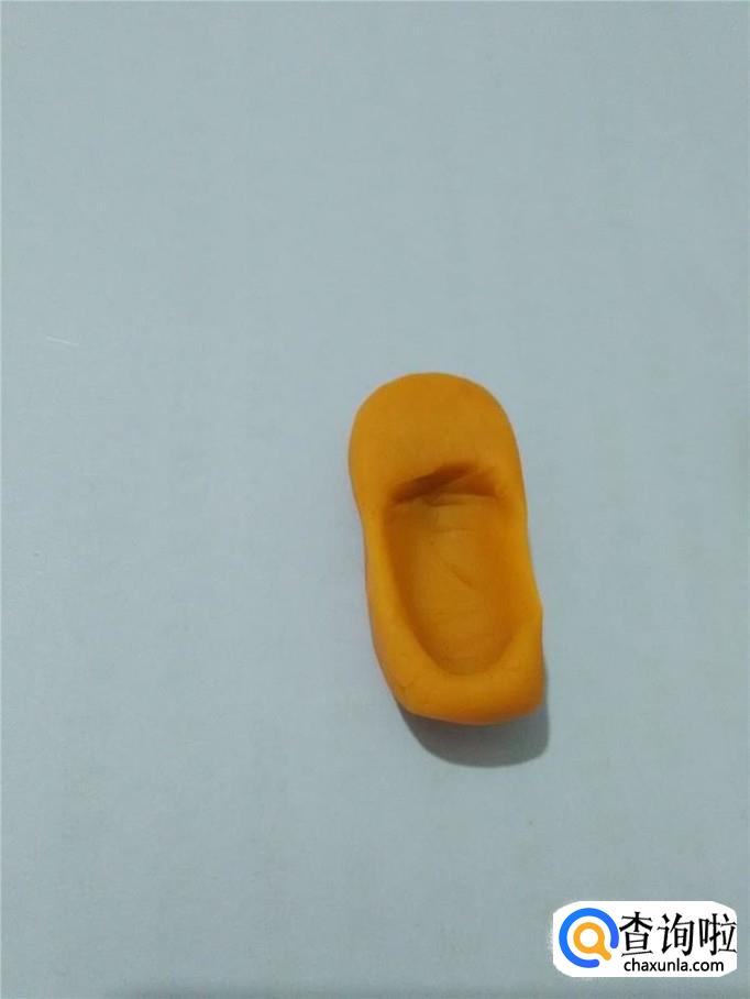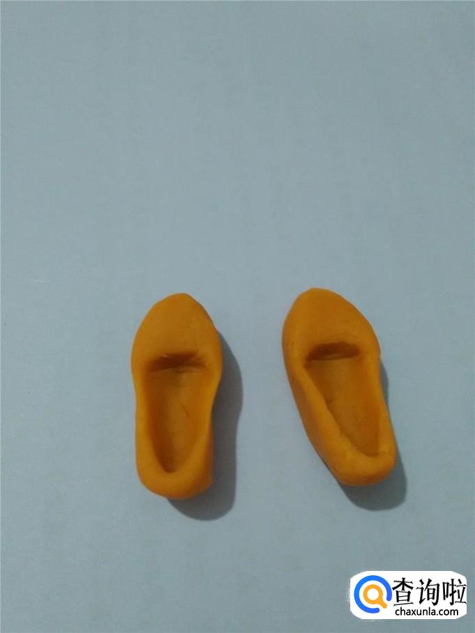 用同样的方法,把另一个椭圆形也按出一个坑来。然后用手把两只鞋的鞋头捏成尖的,并在鞋的中间捏瘦一些。