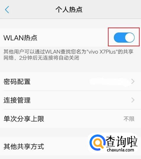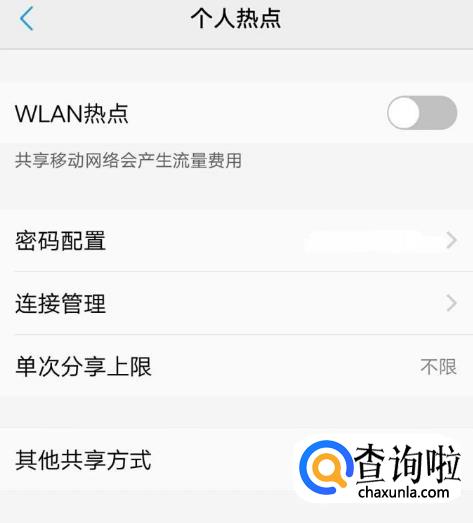 然后我们再回到个人热点页面,点击WLAN热点,变成蓝色即为开启,开启之后点击单次分享上限。