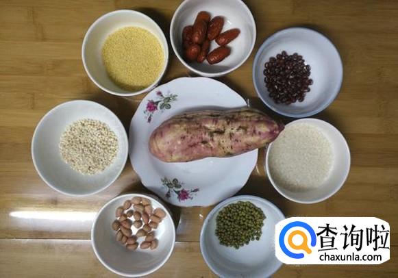 大米、小米、高粱米、大枣、红小豆、绿豆、花生豆、地瓜、阿迪锅