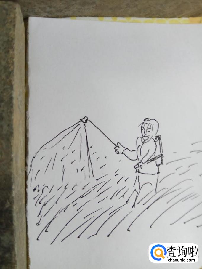 再用两条平行线画出这个人手上拿着的喷雾器,喷雾器的头儿是有点儿像扇形的。