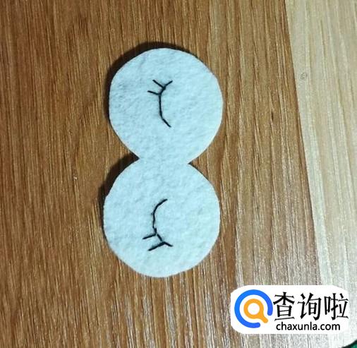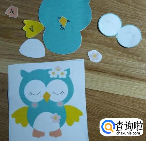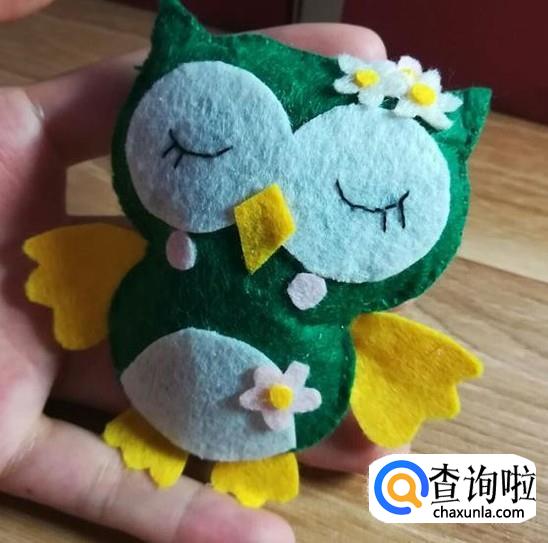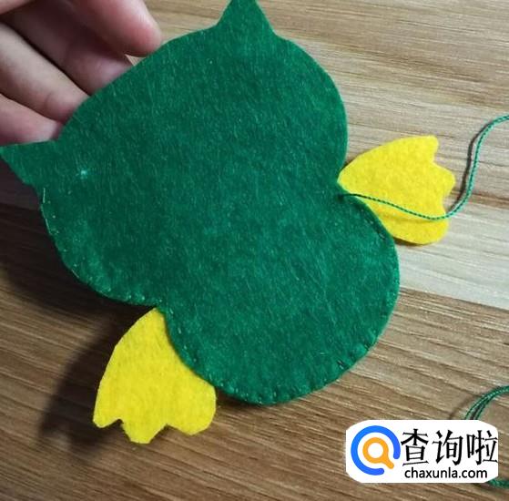 对着图案剪不织布,将不织布剪成图案上的样子,然后缝线,缝到一半的时候塞棉花,让猫头鹰的身体鼓起来,整个身体缝好后,再把猫头鹰的翅膀和脚缝上去。