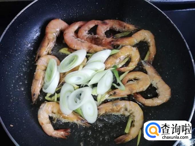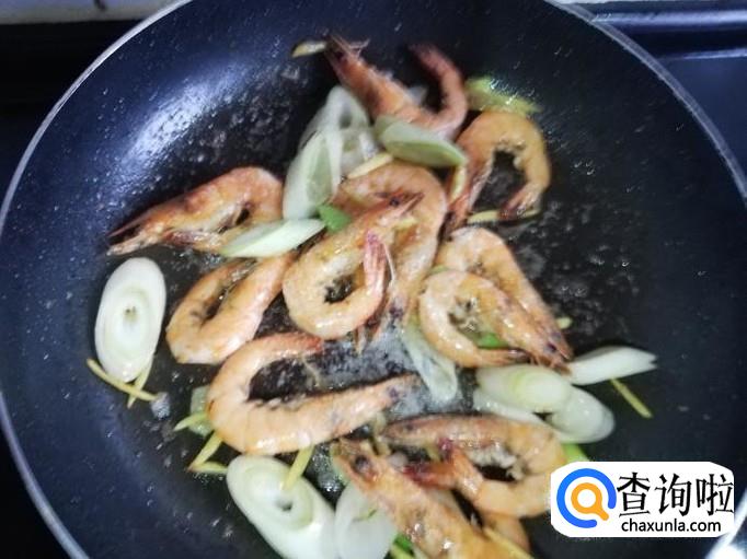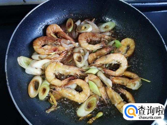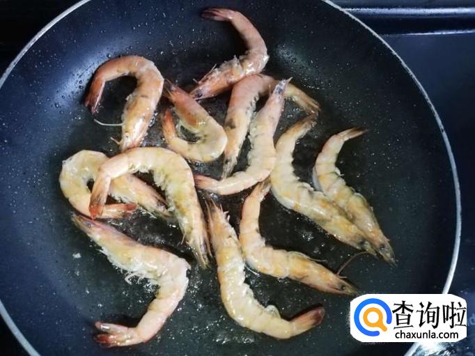 锅烧热,加入适量油,将虾倒入锅中快速翻炒