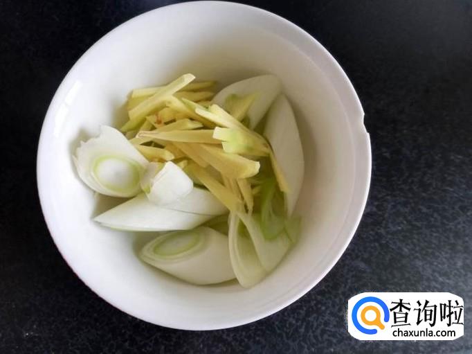 将大葱和姜洗干净,大葱斜切,姜切丝,黄酒和酱油调成料汁